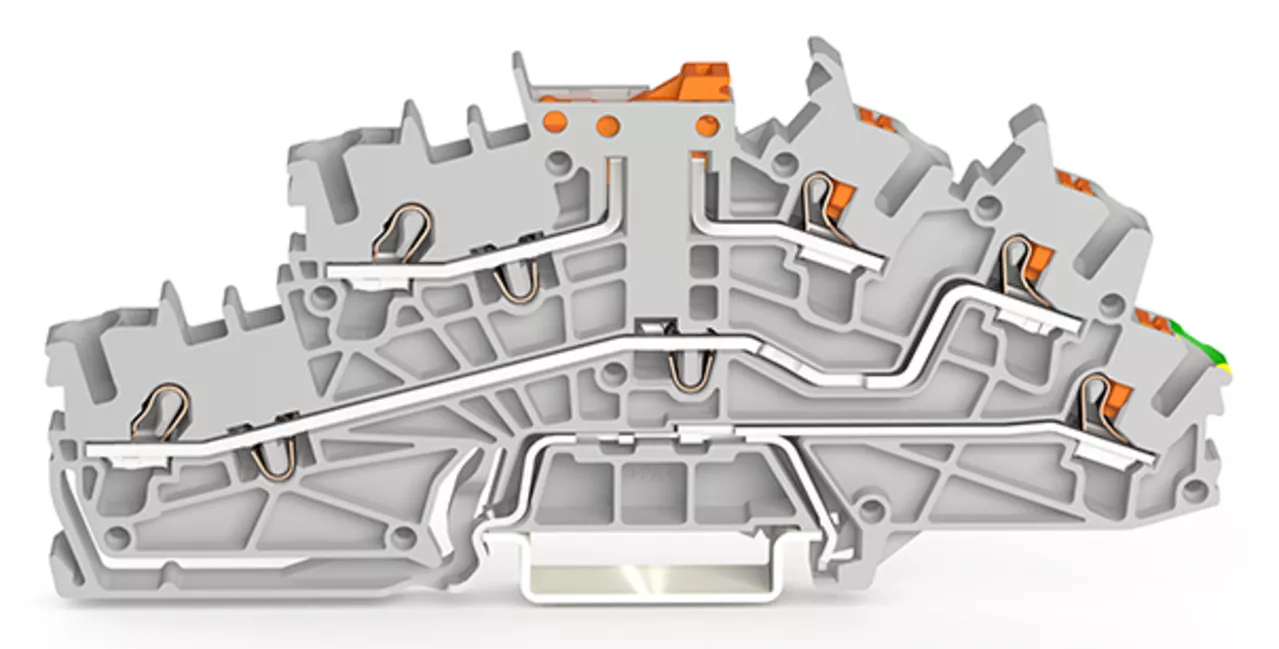 Piętrowa złączka instalacyjna; z otworami montażowymi i przyciskami; 2,5 mm²; z uchylnym łącznikiem nożowym; LTi/L/PE; parter żółto-zielony; Push-in CAGE CLAMP®; 2,50 mm²; szara