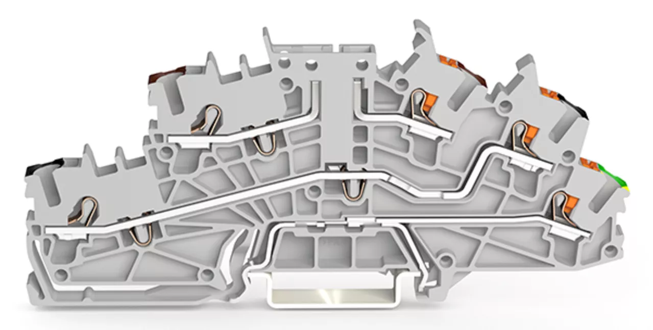 Piętrowa złączka instalacyjna; z otworami montażowymi i przyciskami; 2,5 mm²; złączka bazowa bez łącznika nożowego; P1/P2/PE; piętro górne brązowe; środek czarny; parter żółto-zielony; Push-in CAGE CLAMP®; 2,50 mm²; szara