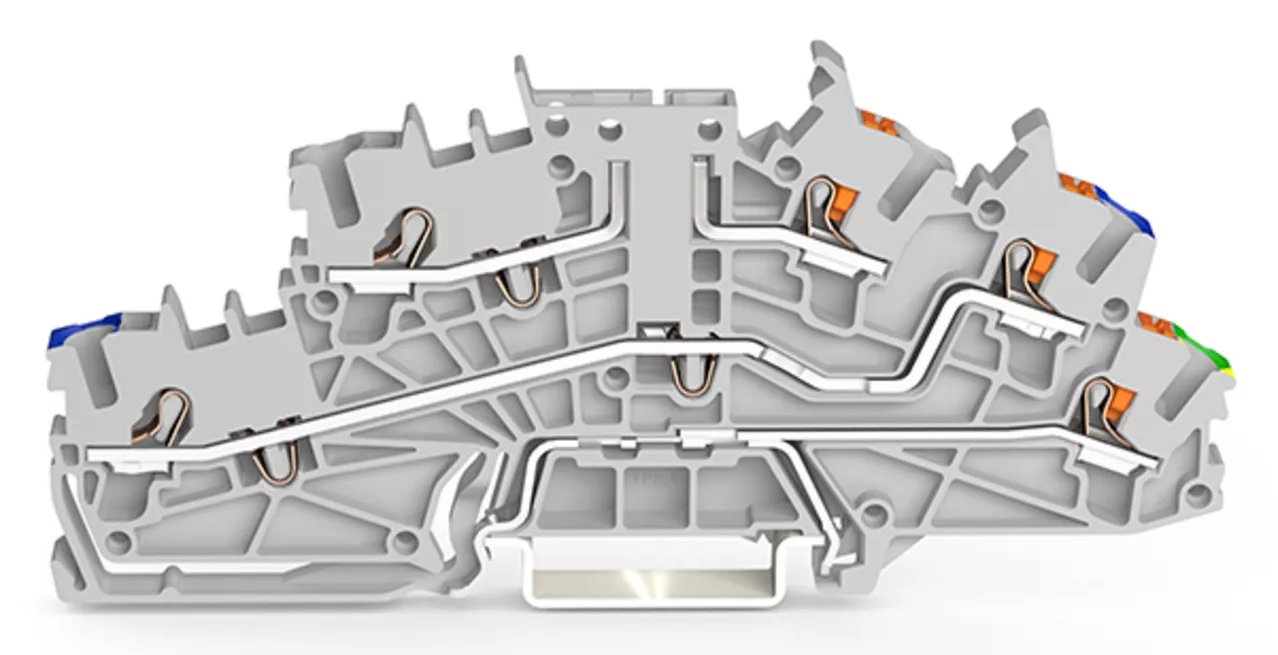 złączka instalacyjna piętrowa; z otworami montażowymi i przyciskami; 2,5 mm²; złączka bazowa bez łącznika nożowego; L/N/PE; Push-in CAGE CLAMP®; 2,50 mm²; szary