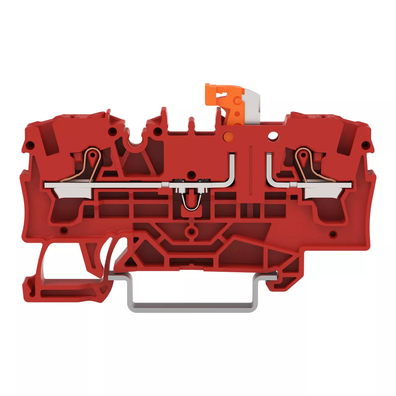 złączka rozłączalna 2-przewodowa; z uchylnym łącznikiem nożowym; z możliwością pomiaru; uchwyt łącznika nożowego pomarańczowy; z przyciskami; na szynę TS 35 x 15 i 35 x 7,5; 4 mm²; Push-in CAGE CLAMP®; 4,00 mm²; czerwony