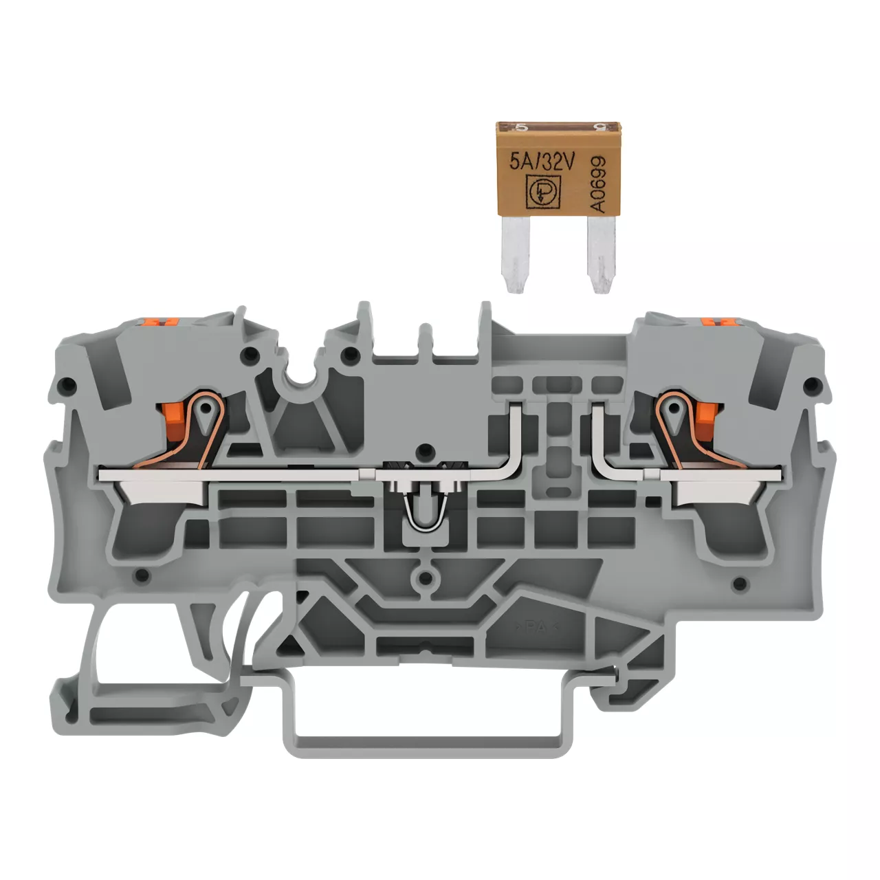 złączka bezpiecznikowa 2-przewodowa; do płaskich bezpieczników samochodowych; z możliwością pomiaru; z przyciskami; bez sygnalizacji przepalenia wkładki; na szynę TS 35 x 15 i 35 x 7,5; Push-in CAGE CLAMP®; szary