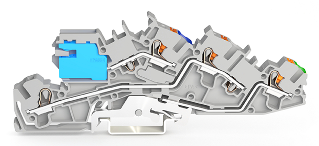 Piętrowa złączka instalacyjna; z otworami montażowymi i przyciskami; 4 mm²; z łącznikiem suwakowym N; NT/L/PE; Push-in CAGE CLAMP®; 4,00 mm²; szara