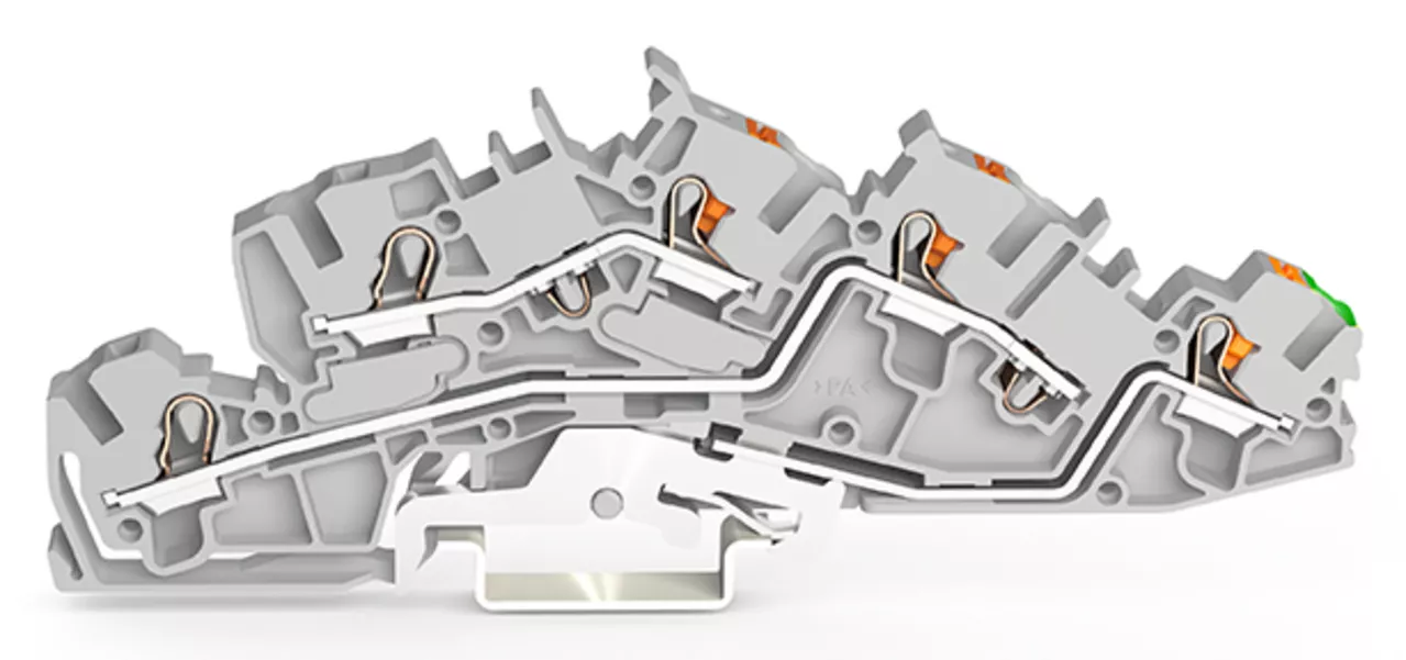 złączka instalacyjna piętrowa; z otworami montażowymi i przyciskami; 4 mm²; L/L/PE; Push-in CAGE CLAMP®; 4,00 mm²; szary
