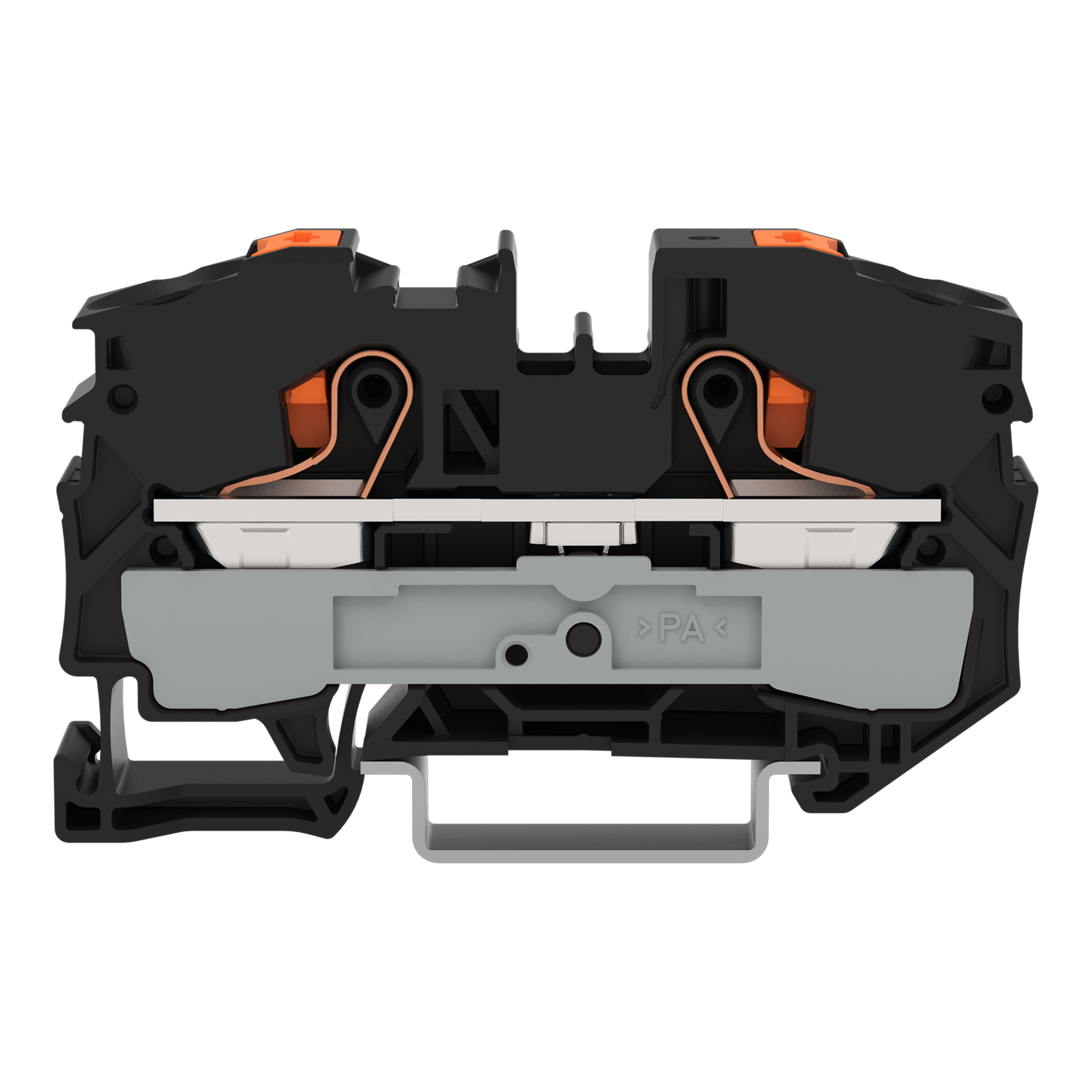 złączka przelotowa 2-przewodowa; z przyciskami; 16 mm²; z otworem pomiarowym; opis z boku i na środku; na szynę TS 35 x 15 i 35 x 7,5; Push-in CAGE CLAMP®; 16,00 mm²; czarny