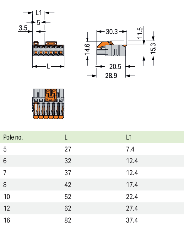 gniazdo 1-przewodowe; dźwignia; Push-in CAGE CLAMP®; 2,5 mm²; raster 5 mm; 16-bieg.; środkowy zaczep ryglujący; szary