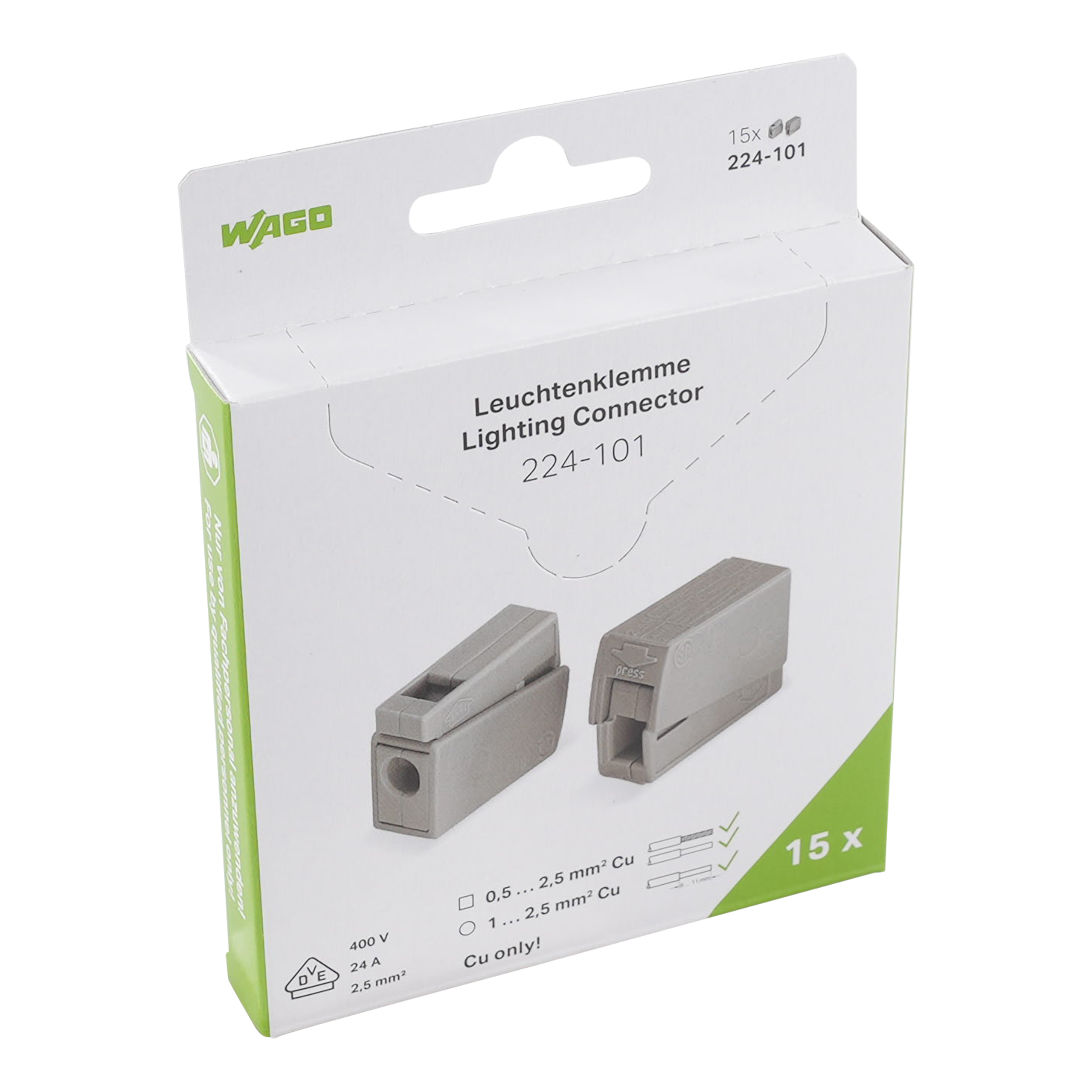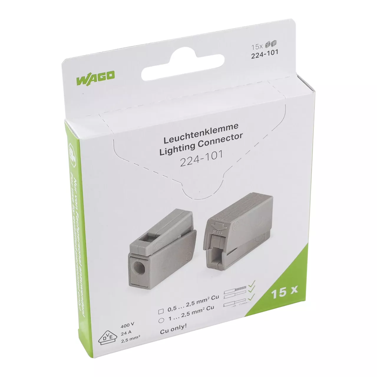 złączka oświetleniowa; przyciski: od strony oprawy ośw.; od strony oprawy: do wszyst. rodz.przew.; od strony instalacji: do przew. jednodr.; seria 224; maks. 2,5 mm²; temperatura otoczenia maks. 60°C; 2,50 mm²; szary