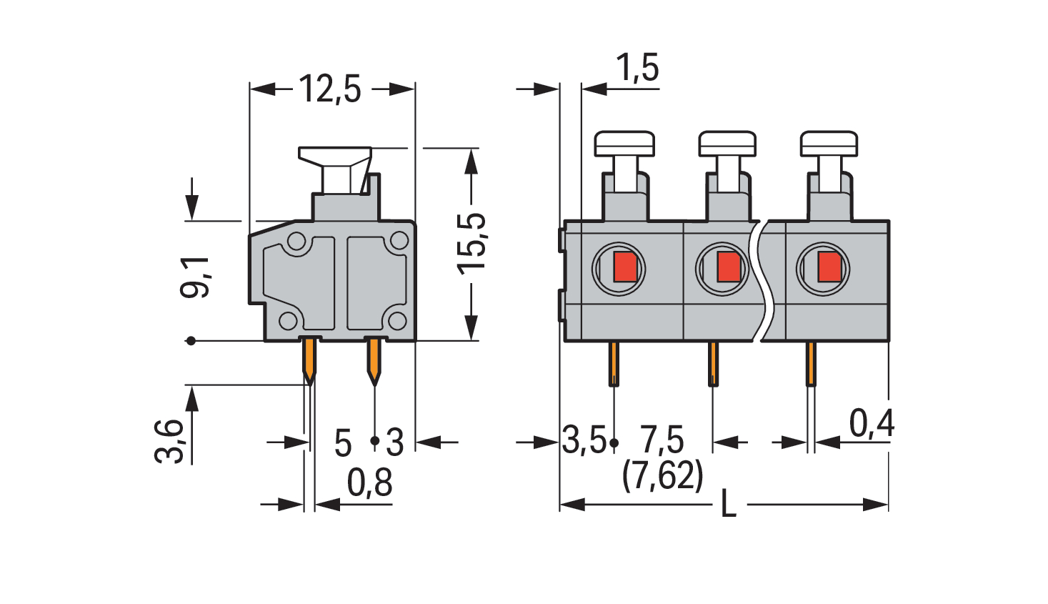Złączka do płytek drukowanych przycisk 1,5 mm² RM 7,5/7,62 mm 3-bieg, szara