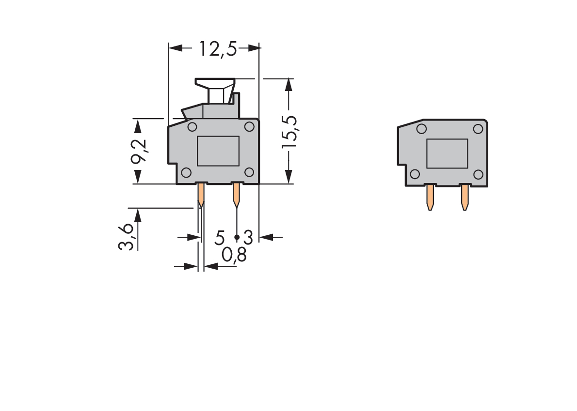 złączka modułowa 2-przewodowa do PCB; przycisk; 0,75 mm²; raster 10/10,16 mm; 1-bieg.; PUSH WIRE®; z otworem pomiarowym; szary
