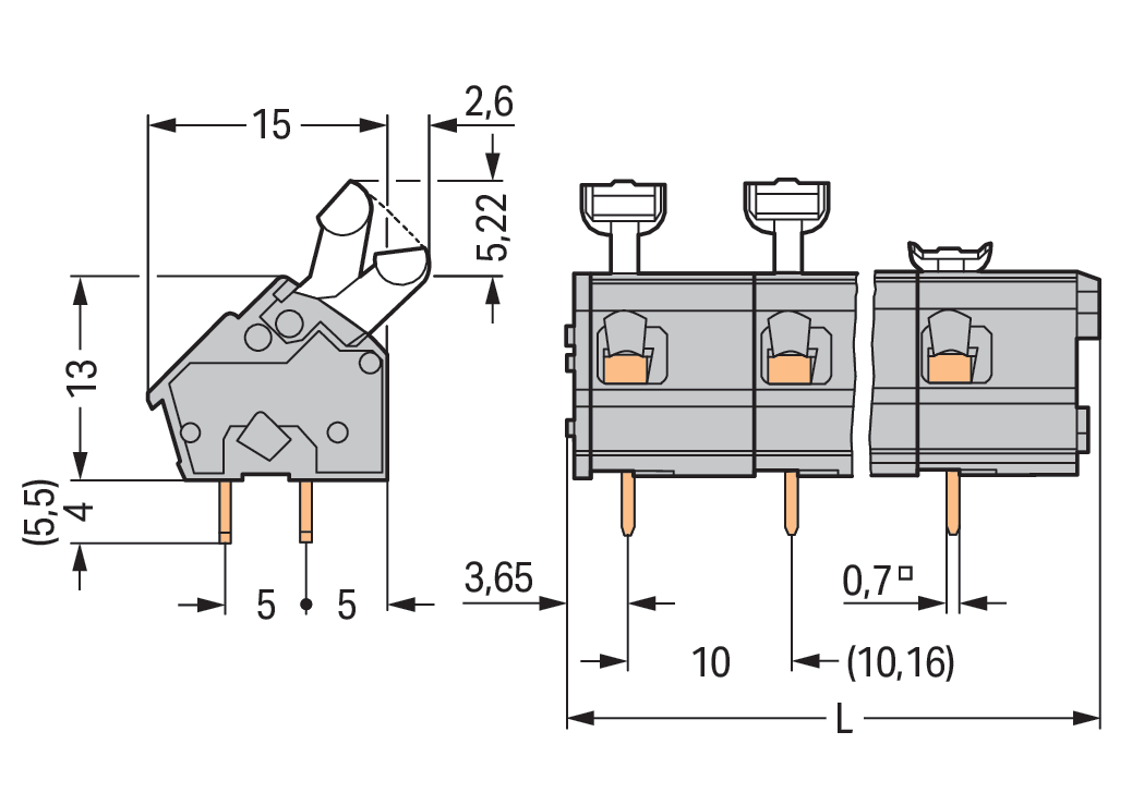 Złączka do płytek drukowanych przycisk 2,5 mm² RM 10/10,16 mm 5-bieg, jasnoszary