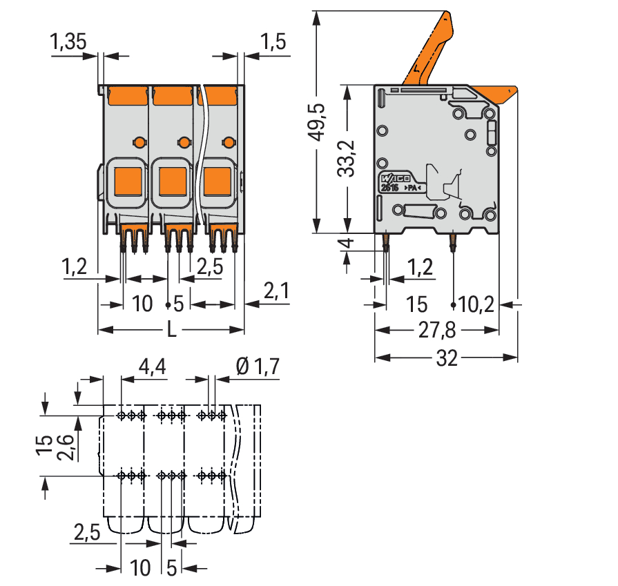 Złącze do PCB dźwignia 16 mm² raster 10 mm 3-bieg., szary