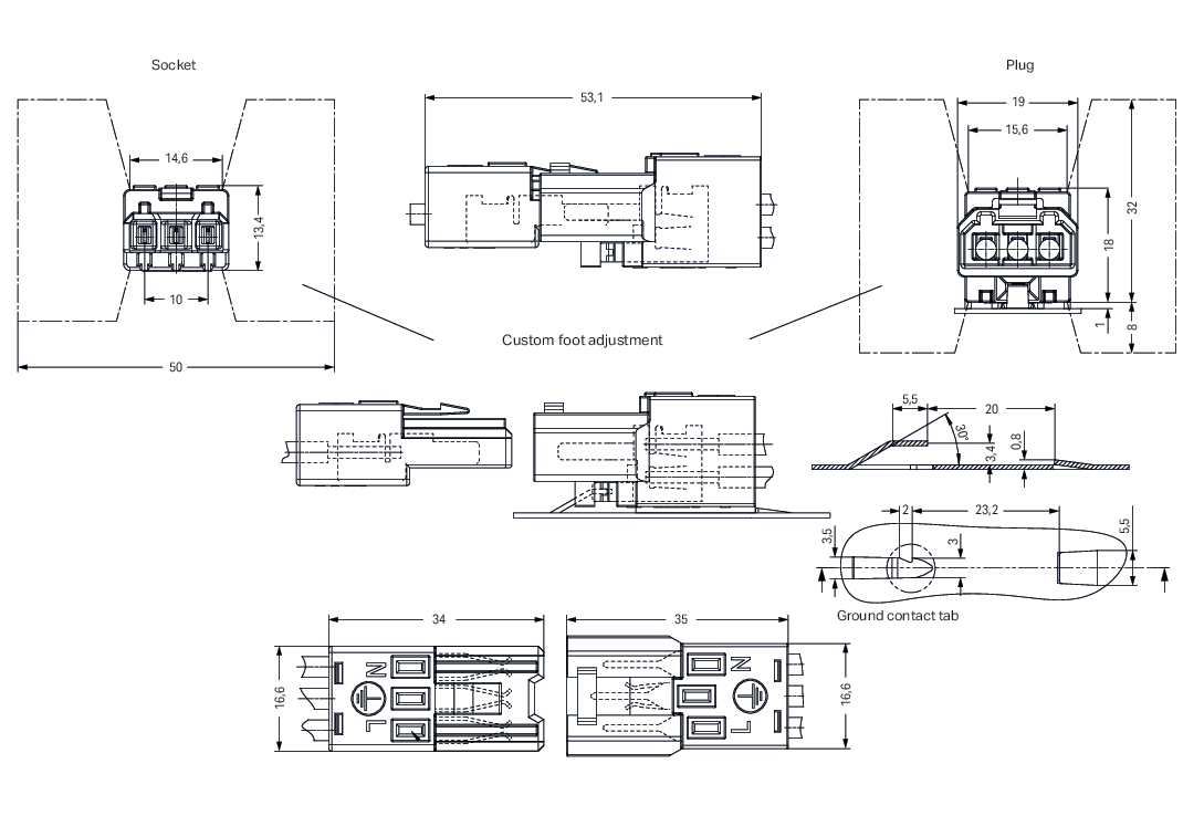 wtyk z możliwością podłączenia blaszki styku PE; ze stykiem PE; 3-bieg.; biały