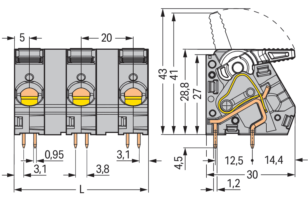 złącze do PCB; dźwignia; 16 mm²; raster 20 mm; 3-bieg.; CAGE CLAMP®; szary