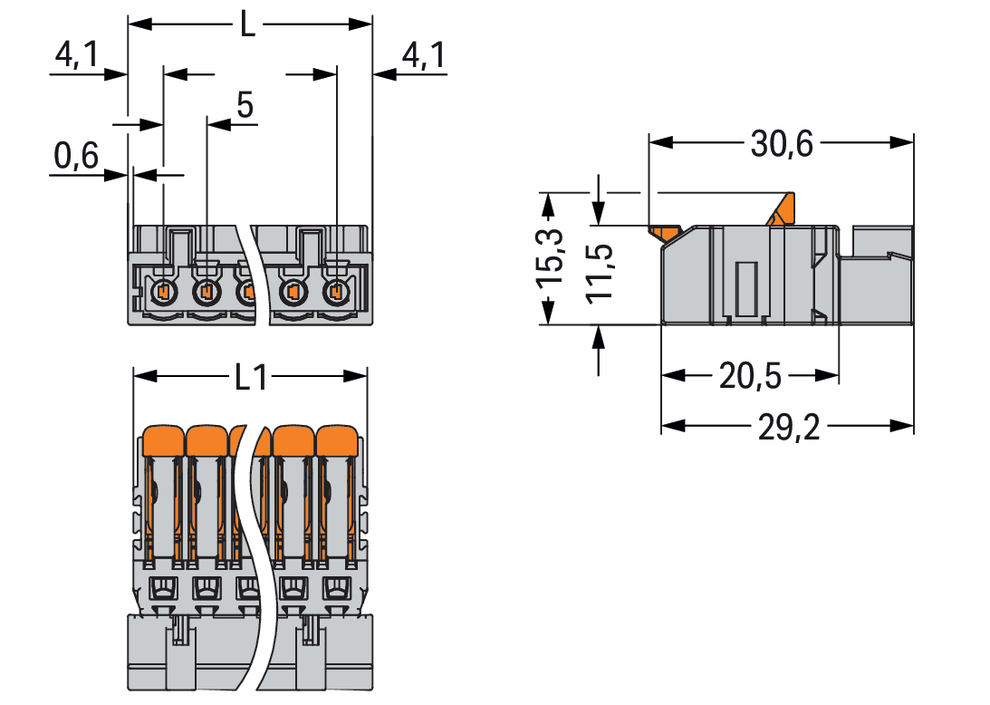 wtyk 1-przewodowy; dźwignia; Push-in CAGE CLAMP®; 2,5 mm²; raster 5 mm; 5-bieg.; 100% ochrona przed błędnym połączeniem; 2,50 mm²; jasnoszary