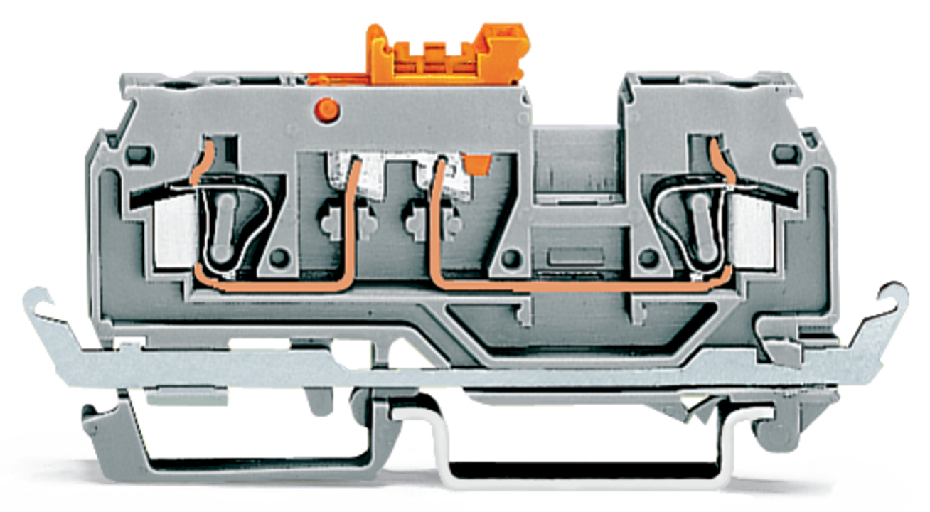 złączka rozłączalno-pomiarowa 2-przewodowa; z szyną ekranową; z otworem pomiarowym; do wtyku pomiarowego Ø 2 mm i Ø 3 mm; na szynę TS 35 x 15 i 35 x 7,5; 2,5 mm²; CAGE CLAMP®; 2,50 mm²; szary