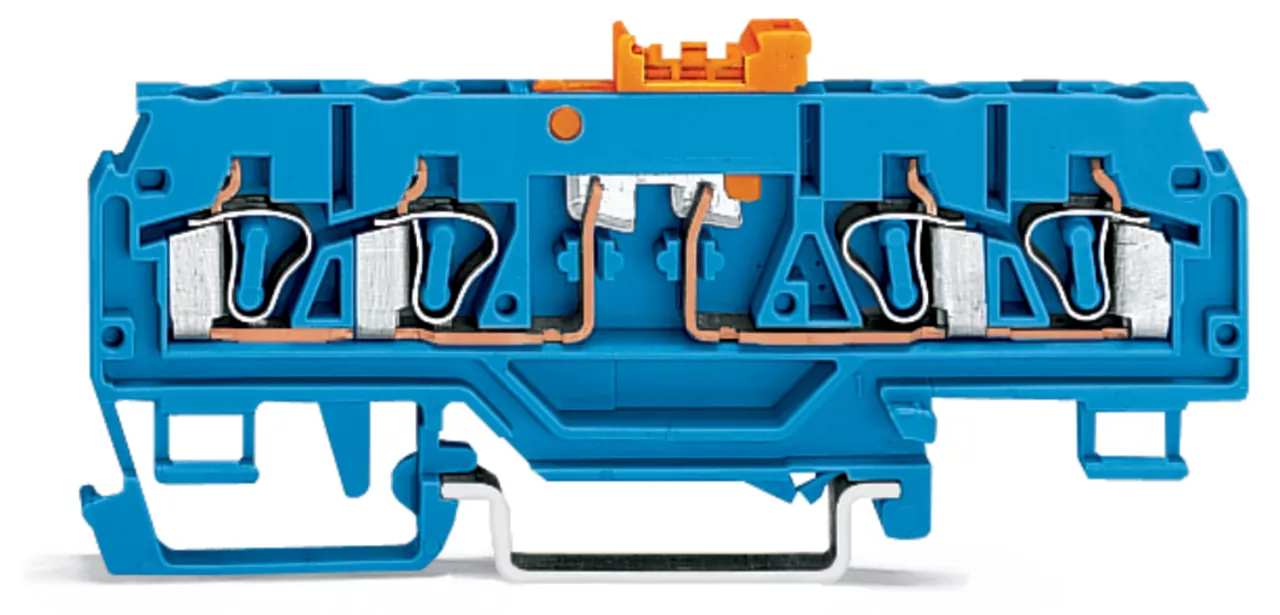 złączka rozłączalno-pomiarowa 4-przewodowa; z uchylnym łącznikiem nożowym; z otworem pomiarowym; do wtyku pomiarowego Ø 2 mm i Ø 3 mm; do zastosowań Ex i; na szynę TS 35 x 15 i 35 x 7,5; 2,5 mm²; CAGE CLAMP®; 2,50 mm²; niebieski