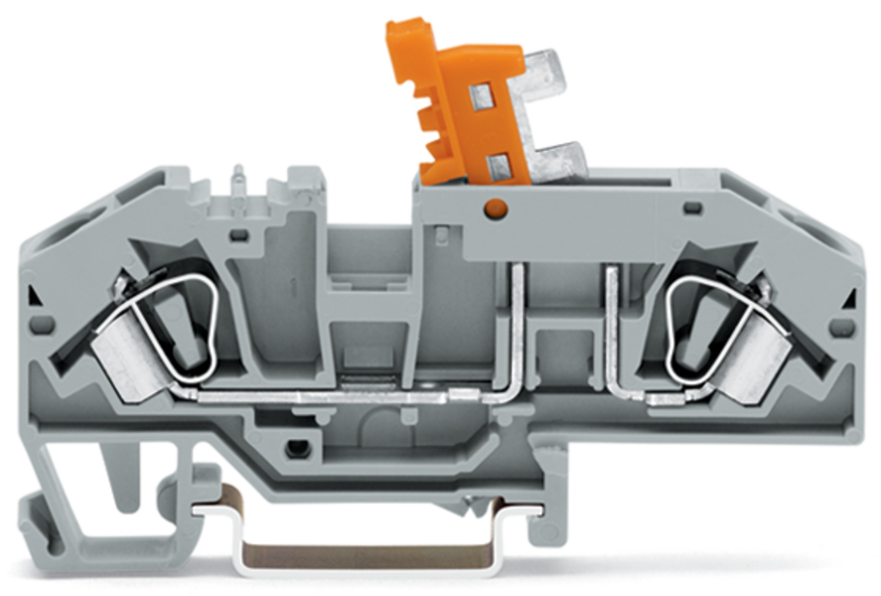złączka rozłączalna 2-przewodowa; z możliwością pomiaru; uchwyt łącznika nożowego pomarańczowy; na szynę TS 35 x 15 i 35 x 7,5; 6 mm²; CAGE CLAMP®; 6,00 mm²; niebieski