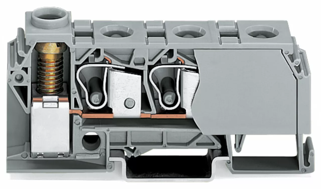 złączka rozgałęźna; 10 mm²; boczne miejsca na oznaczniki; na szynę TS 35 x 15 i 35 x 7,5; zacisk śrubowy i CAGE CLAMP®; 3 x zacisk CAGE CLAMP® 10 mm²; 1 x zacisk śrubowy 35 mm²; 10,00 mm²; niebieski