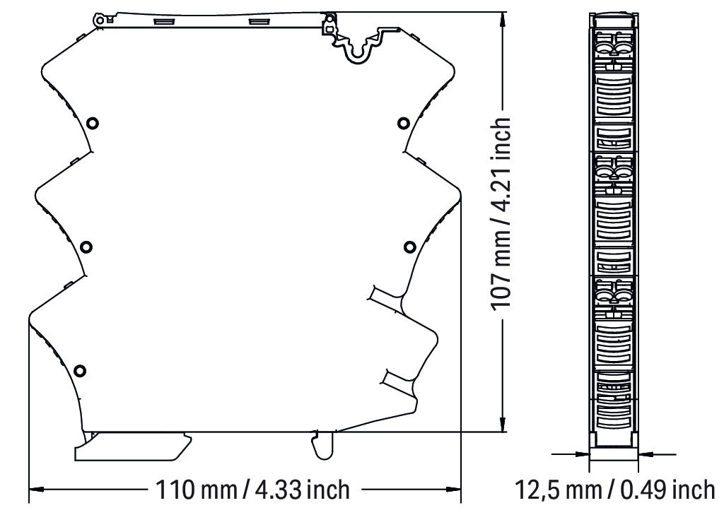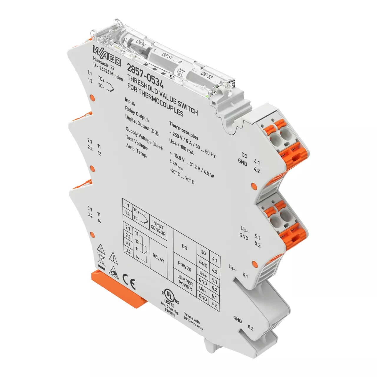przełącznik wartości granicznej; termopary; 1 zestyk zwierny; moduł wyjść dwustanowych; konfiguracja przy użyciu oprogramowania; napięcie zasilania 24 V DC; szerokość 12,5 mm