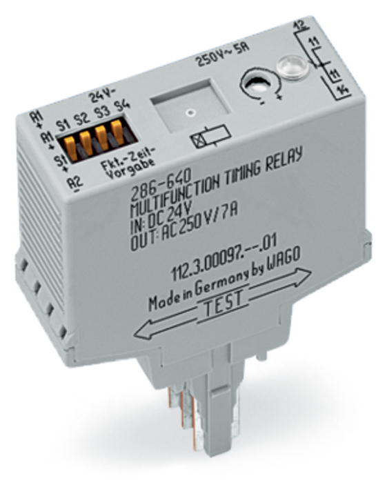 moduł przekaźnika czasowego; znamionowe napięcie wejściowe 24 V DC; maksymalny prąd długotrwały 5 A; kolejnictwo; wielofunkcyjny; sygnalizacja statusu czerwony; szerokość 20 mm; szary