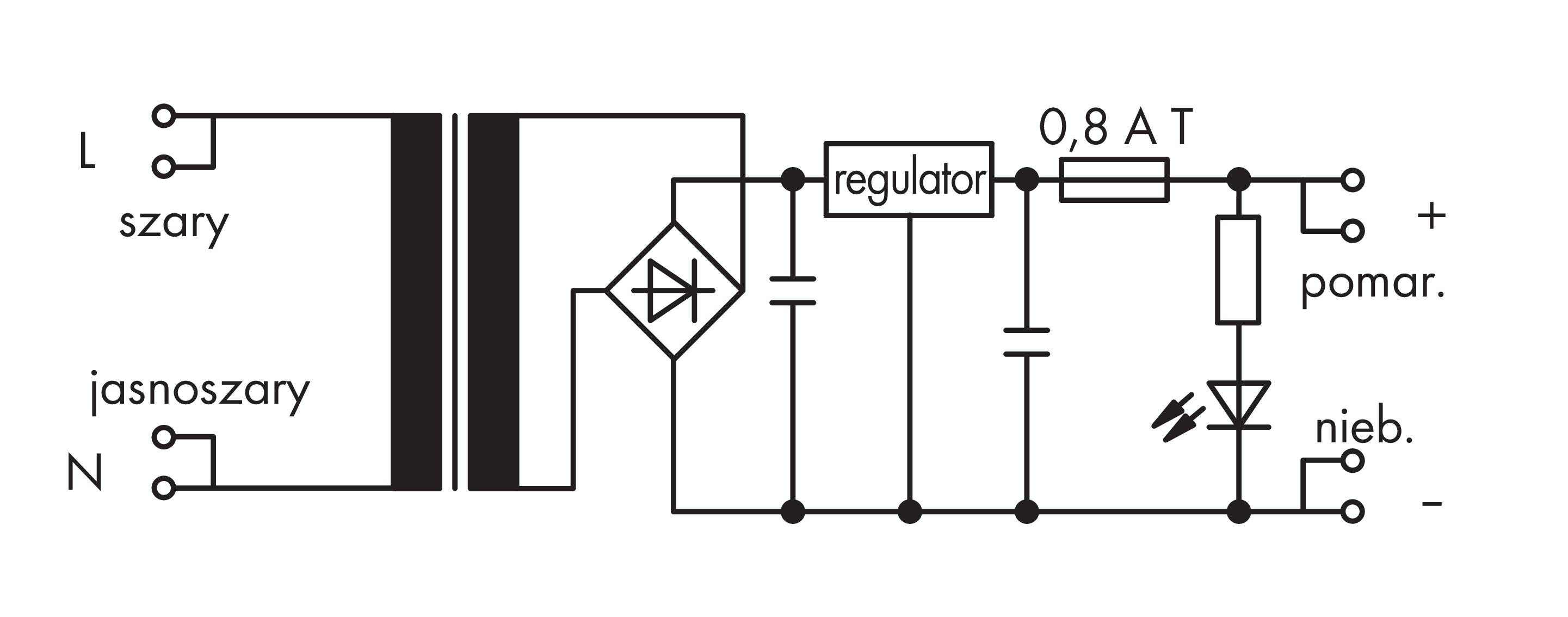 zasilacz stabilizowany; napięcie wejściowe 230 V AC; napięcie wyjściowe 12 V DC; prąd wyjściowy 0,5 A; w podstawce montażowej; 2,50 mm²