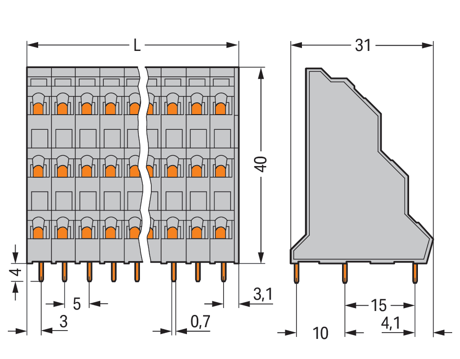 3-piętrowa złączka do płytek drukowanych 2,5 mm² RM 5 mm 18-bieg, szara 737-106