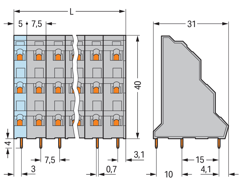 3-piętrowa złączka do płytek drukowanych 2,5 mm² RM 7,5 mm 9-bieg, szara 737-503