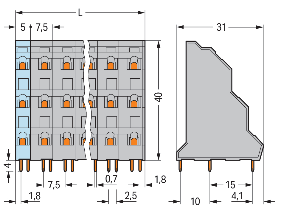 3-piętrowa złączka do płytek drukowanych 2,5 mm² RM 7,5 mm 9-bieg, szara 737-553