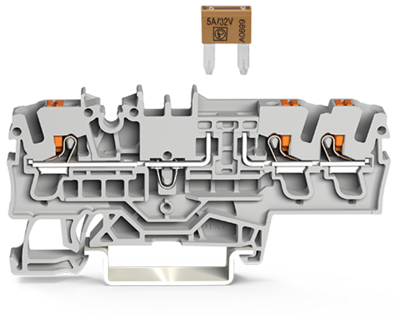 złączka bezpiecznikowa 3-przewodowa; do pł. bezpiecz. samochod. Mini; zgodnie z DIN 7258-3f, ISO 8820-3; z możliwością pomiaru; z przyciskami; bez sygnalizacji przepalenia wkładki; 2,5 mm²; Push-in CAGE CLAMP®; szary