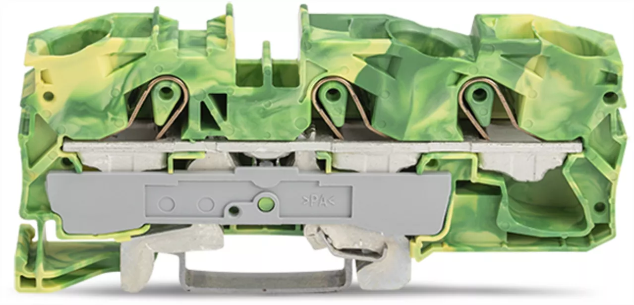 złączka PE 3-przewodowa; 16 mm²; do zastosowań Ex e II; opis z boku i na środku; na szynę TS 35 x 15 i 35 x 7,5; Push-in CAGE CLAMP®; 16,00 mm²; żółto-zielony