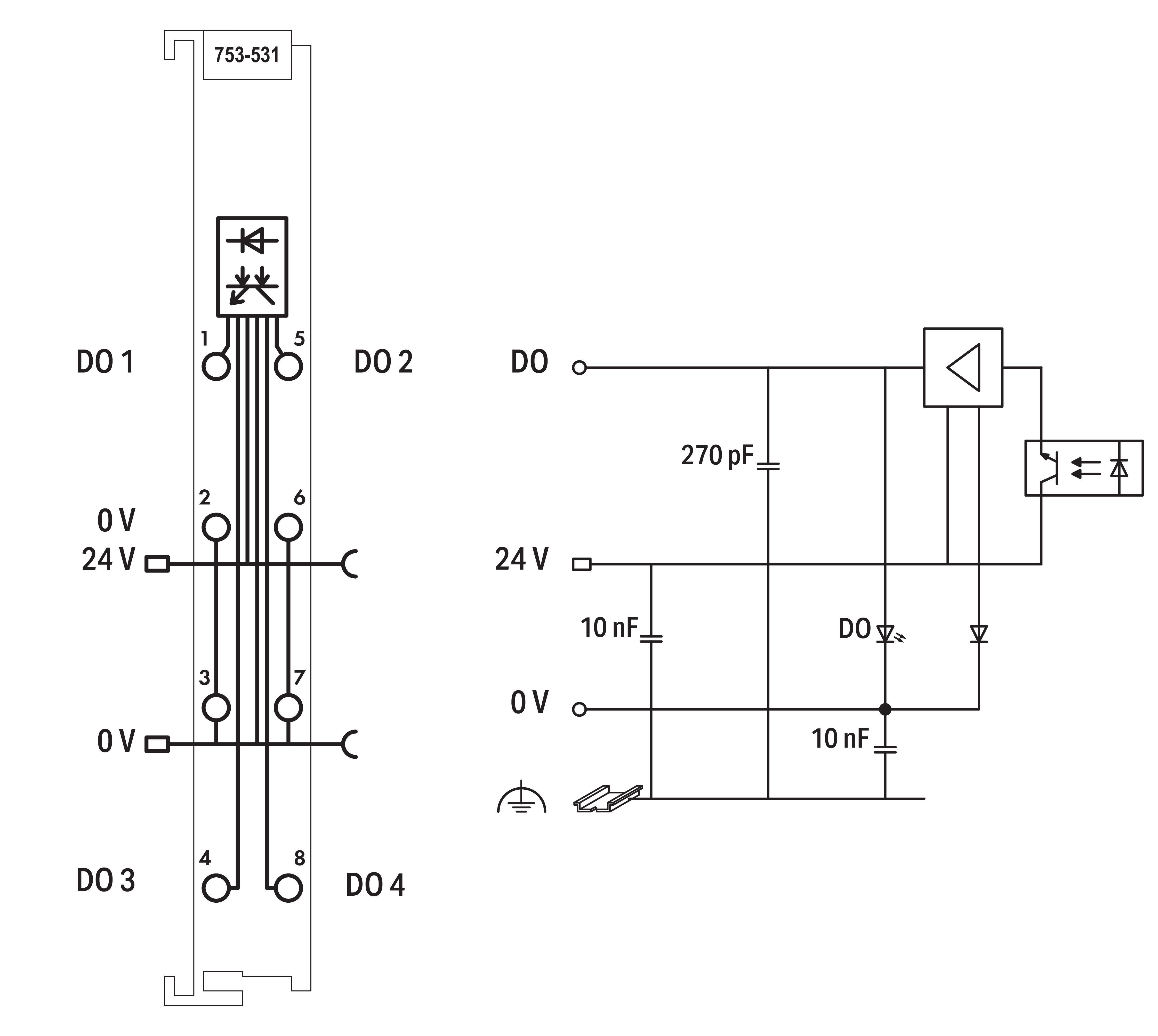 4-kanałowe wyjście dwustanowe; 24 V DC; 0,5 A; podłączanie 2-przewodowe 753-531