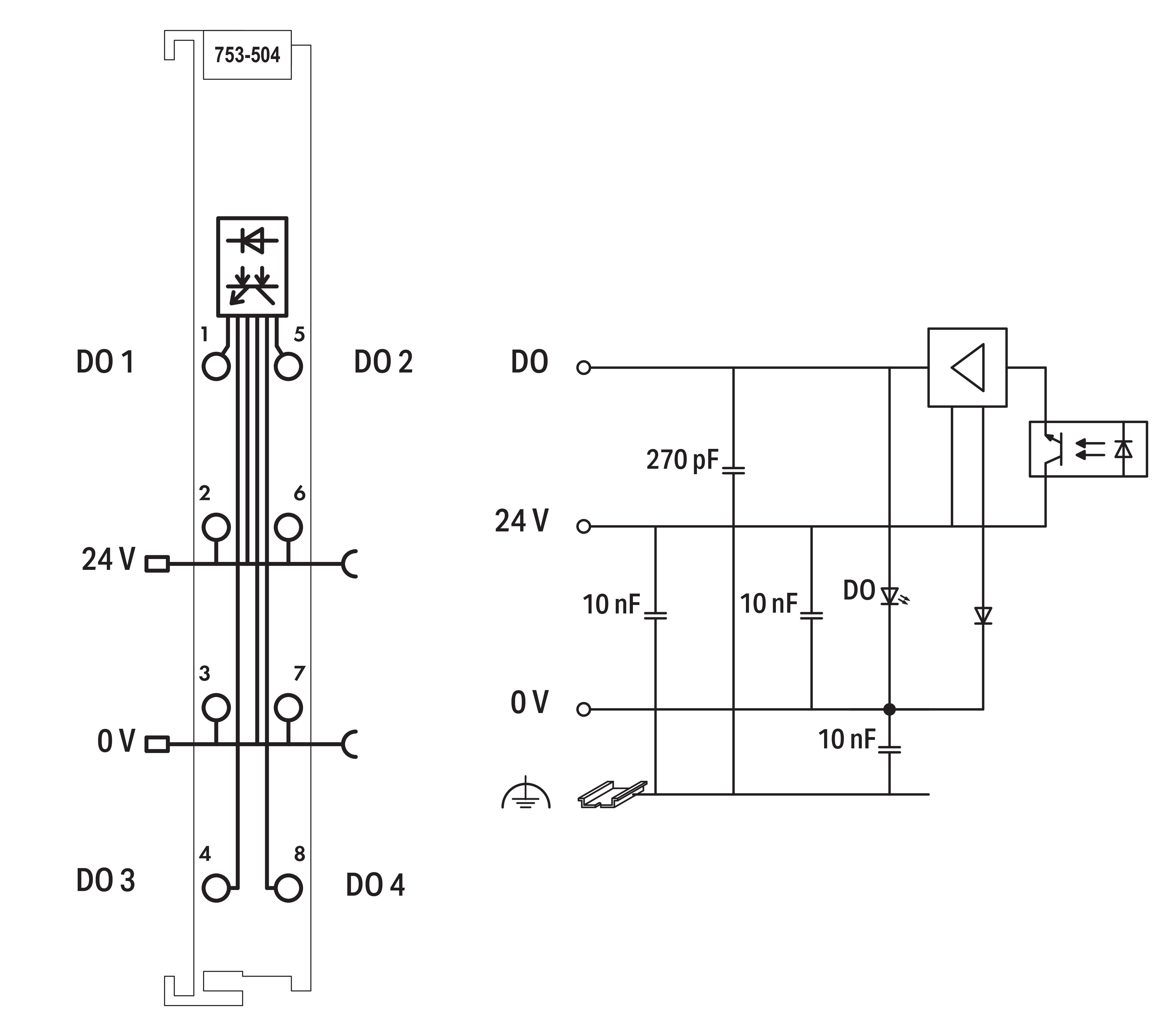 4-kanałowe wyjście dwustanowe 24 VDC 0,5A 753-504