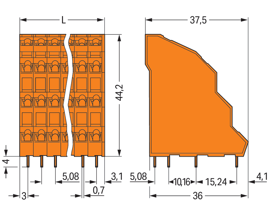 4-piętrowa złączka do płytek drukowanych 2,5 mm² RM 5,08 mm 96-biegunów, pomarańczowa 738-324