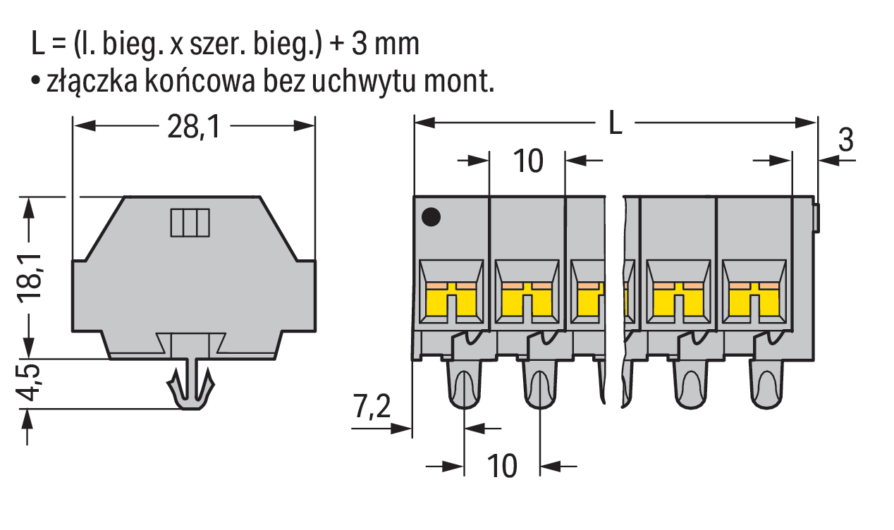 listwa zaciskowa 4-przewodowa; bez przycisków; ze stopkami zatrzaskowymi; 5-bieg.; do płyty o grubości 0,6 ... 1,2 mm; otwór montażowy Ø 3,5 mm; 2,5 mm²; CAGE CLAMP®; 2,50 mm²; szary