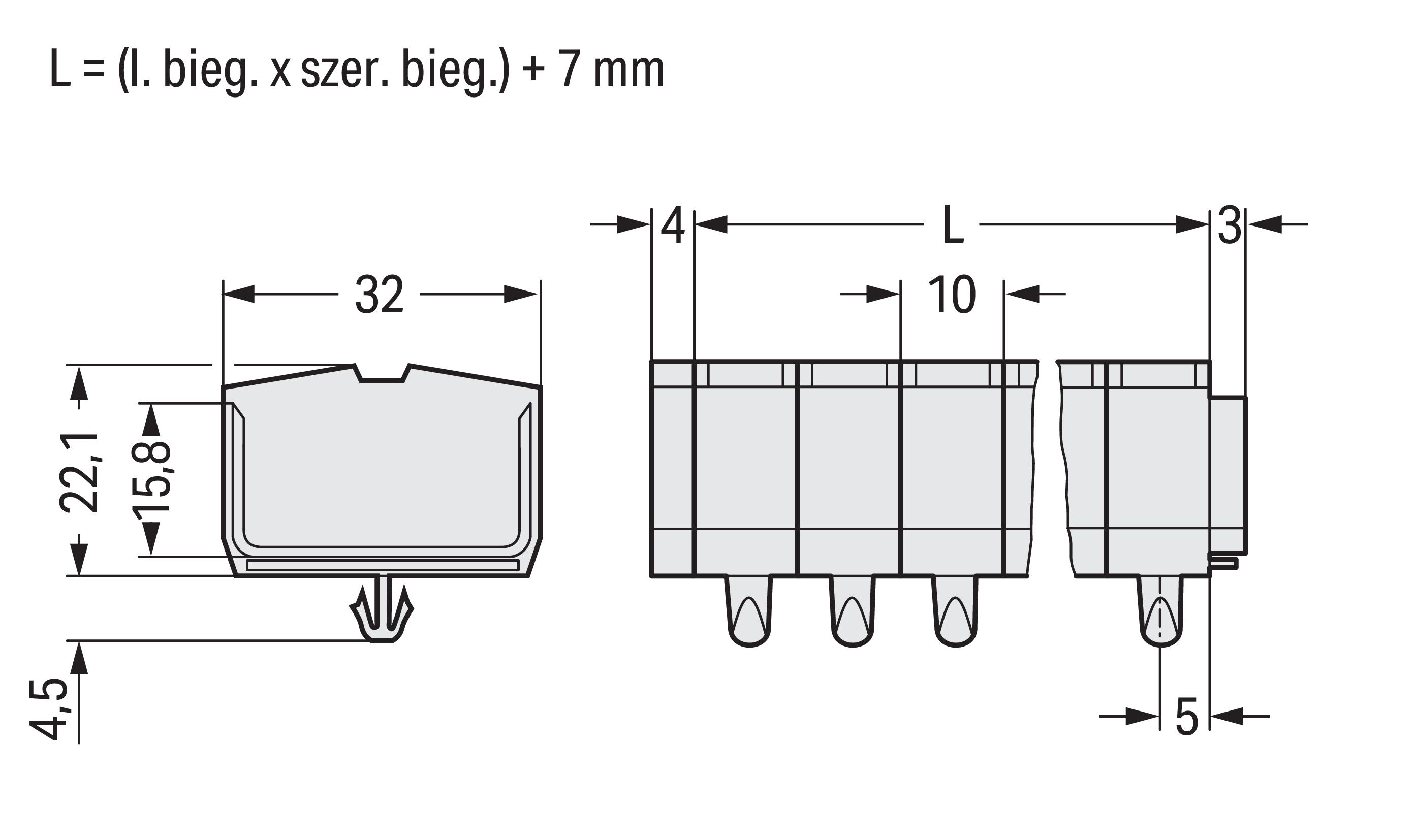 listwa zaciskowa 4-przewodowa; bez przycisków; do zastosowań Ex e II; ze stopkami zatrzaskowymi; 5-bieg.; do płyty o grubości 0,6 ... 1,2 mm; otwór montażowy Ø 3,5 mm; 2,5 mm²; CAGE CLAMP®; 2,50 mm²; jasnoszary