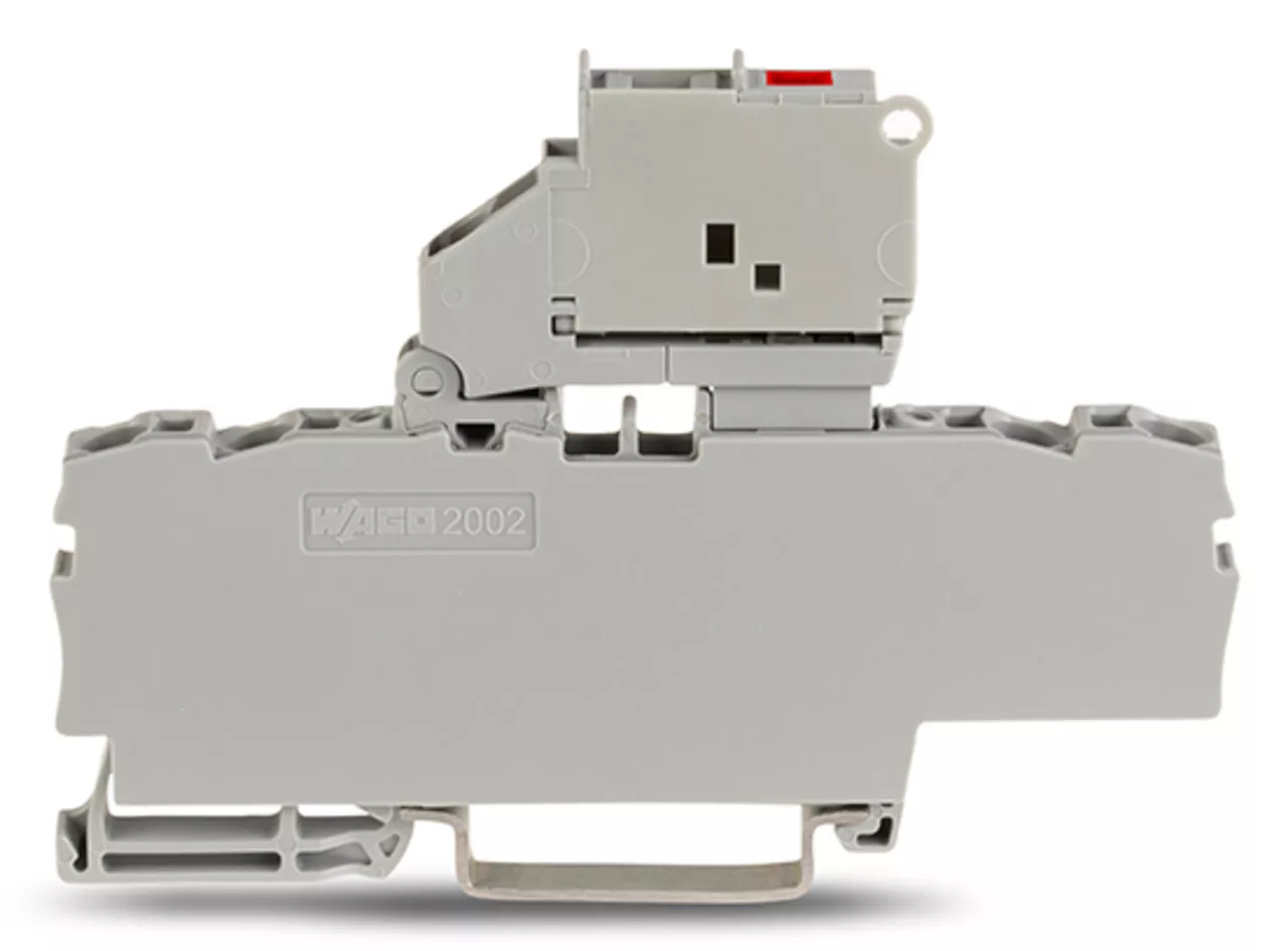 4-przewodowa złączka bezpiecznikowa z uchylną podstawką bezpiecznika ze ścianką końcową, szara 2002-1811/1000-836