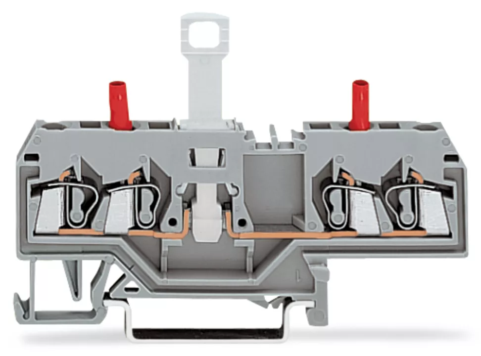 złączka rozłączalno-pomiarowa 2-przewodowa; bez uchylnego łącznika nożowego; z izolowanymi gniazdami pomiarowymi; gniazdo pomiarowe czerwone; na szynę TS 35 x 15 i 35 x 7,5; 2,5 mm²; CAGE CLAMP®; 2,50 mm²; szary