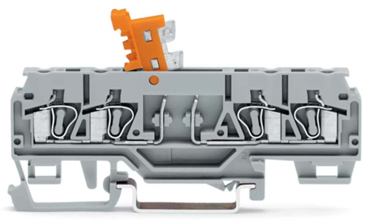 złączka rozłączalno-pomiarowa 4-przewodowa; z uchylnym łącznikiem nożowym; z otworem pomiarowym; uchwyt łącznika nożowego pomarańczowy; na szynę TS 35 x 15 i 35 x 7,5; 2,5 mm²; CAGE CLAMP®; 2,50 mm²; szary