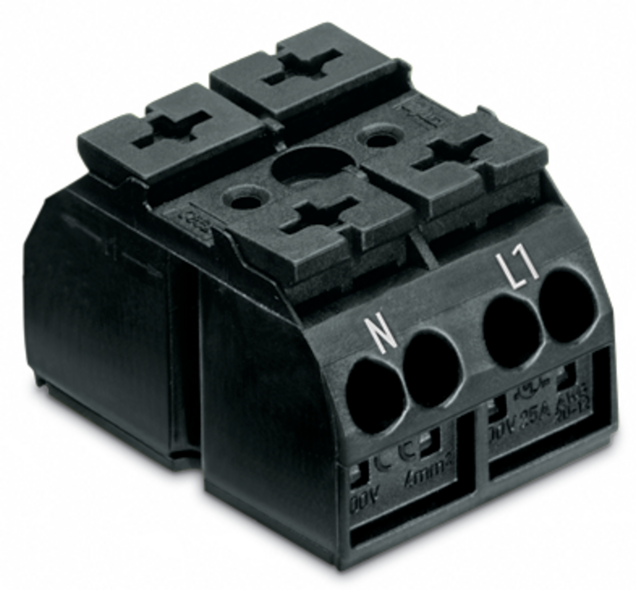 blok zasilający 4-przewodowy; bez styku PE; N-L1; 2-bieg.; 1 stopka zatrzaskowa na biegun; 4 mm²; czarny