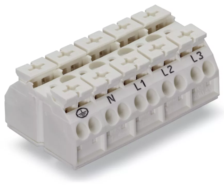 blok zasilający 4-przewodowy; ze stykiem PE; PE-N-L1-L2-L3; 5-bieg.; 4 mm²; biały