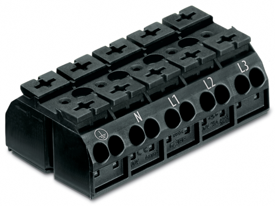 blok zasilający 4-przewodowy; ze stykiem PE; PE-N-L1-L2-L3; 5-bieg.; do śruby i nakrętki M3; 4 mm²; czarny
