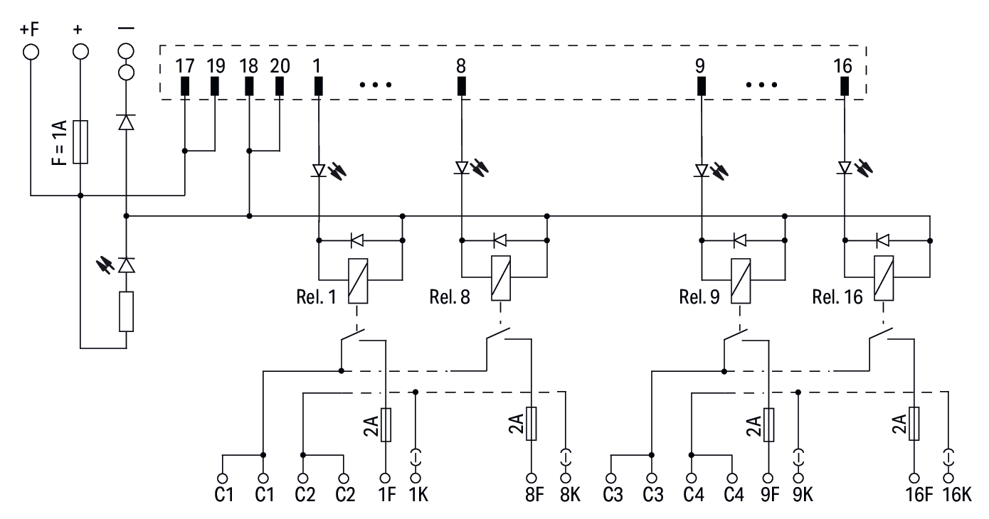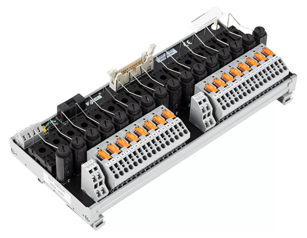 moduł przejściowy do oprzewodowania systemowego; wielowtyk zgodny z DIN 41651; wtyk; 20-bieg.; moduł wyjść przekaźnikowych 16-kanałowy; 1 zestyk zwierny; ze złączką rozłączalną i bezpiecznikiem; bez przekaźnika; w podstawce montażowej
