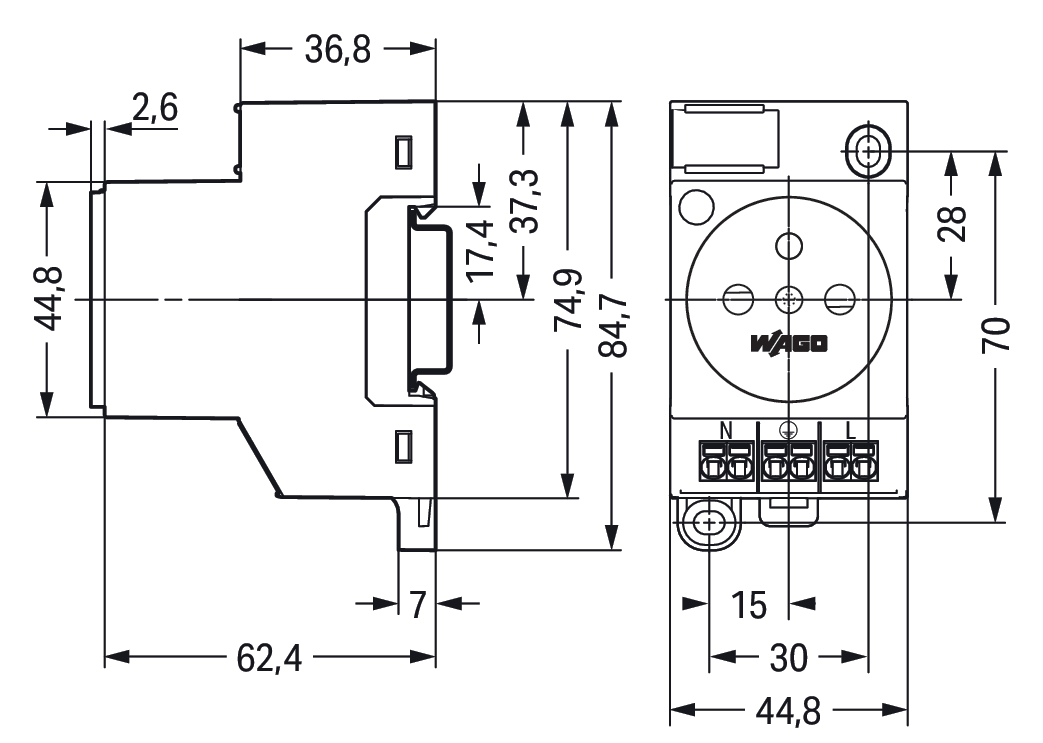 Gniazdo instal. do szaf sterowniczych do montażu na szynie i montażu śrubowego do wtyku typ E, CEE 7/5