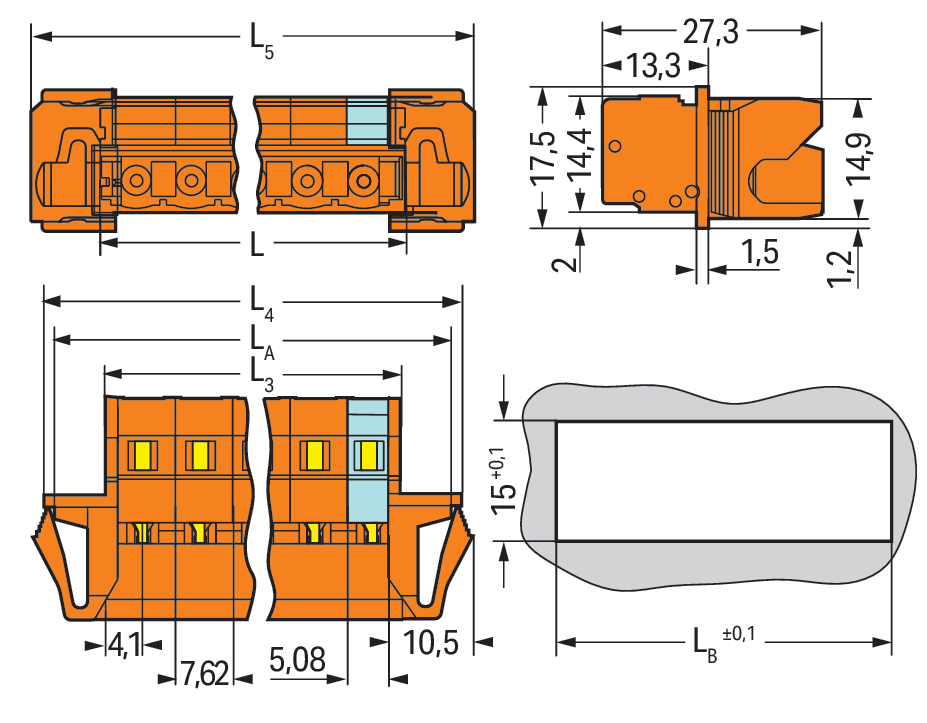 wtyk 1-przewodowy; CAGE CLAMP®; 2,5 mm²; raster 7,62 mm; 5-bieg.; uchwyt Snap-In; 2,50 mm²; pomarańczowy