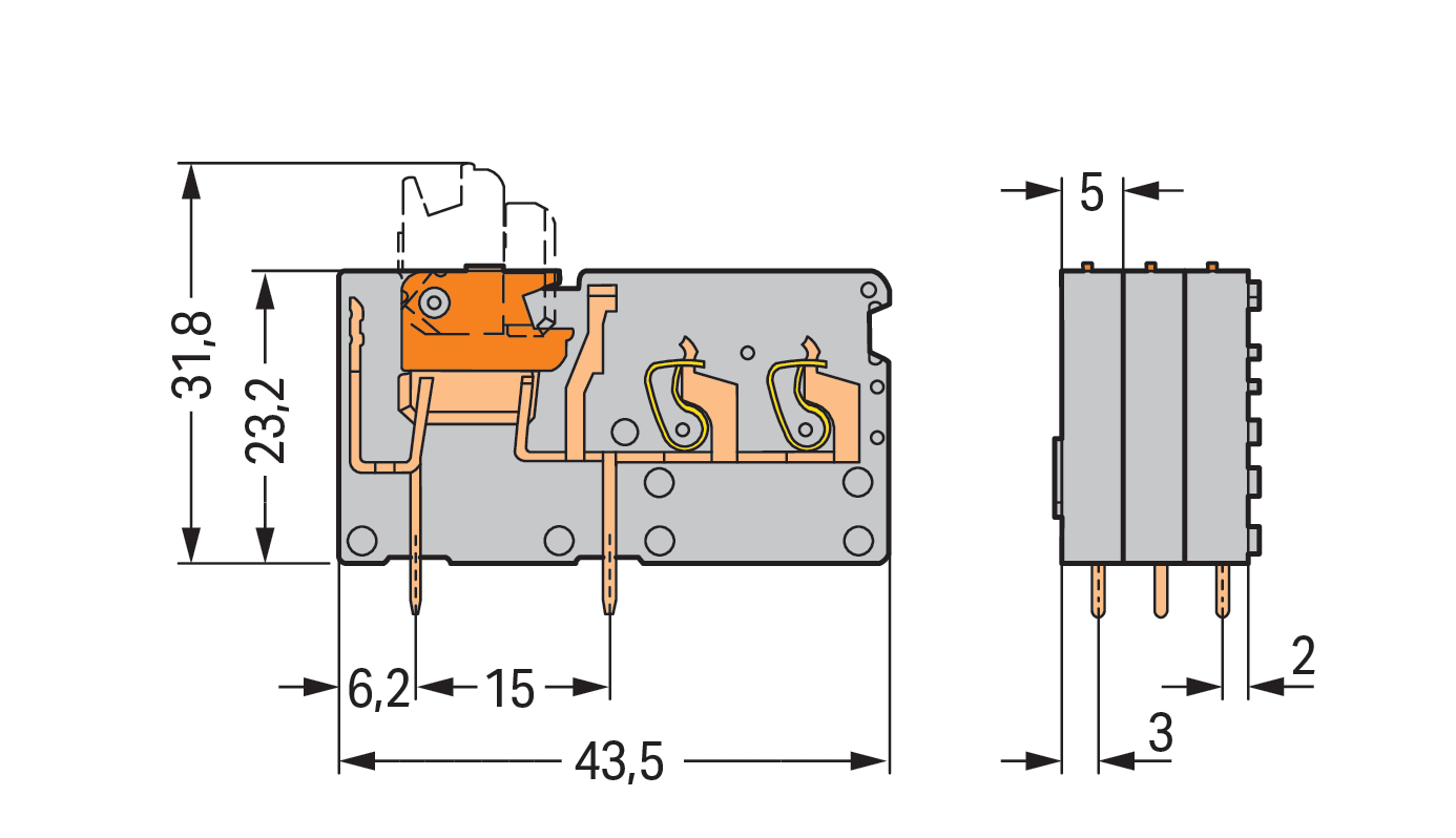 2-przew modul zł do płytek druk z łącznikiem nożowym 2,5 mm² RM 5 mm, szara