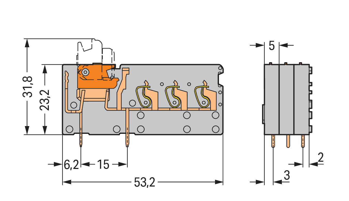 3-przew modul zł do płytek druk z łącznikiem nożowym 2,5 mm² RM 5 mm, szara