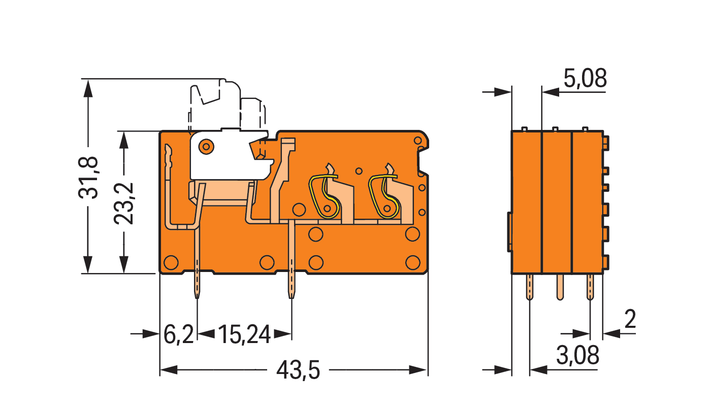 2-przew modul zł do płytek druk z łącznikiem nożowym 2,5 mm² RM 5,08 mm, pomarańczowa