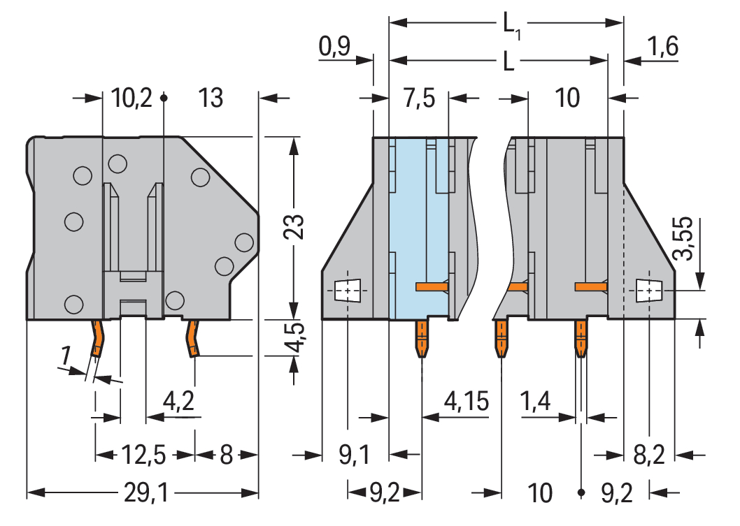 Złączka do płytek drukowanych 6 mm² RM 10 mm 3-bieg, niebieski