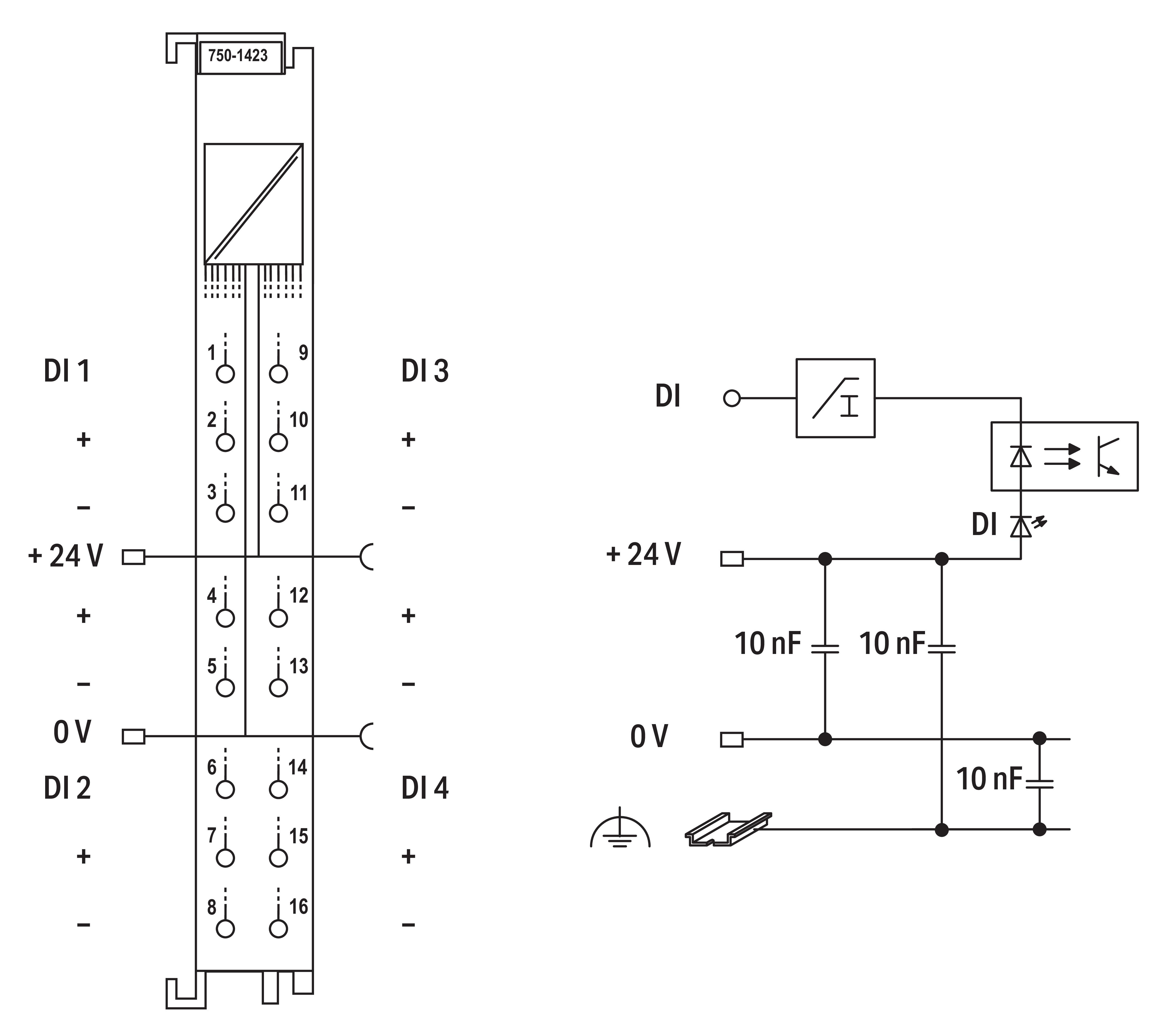 4-kanałowe wejście dwustanowe; 24 V DC; 0,2 ms; załączanie potencjałem niskim; podłączanie 3-przewodowe