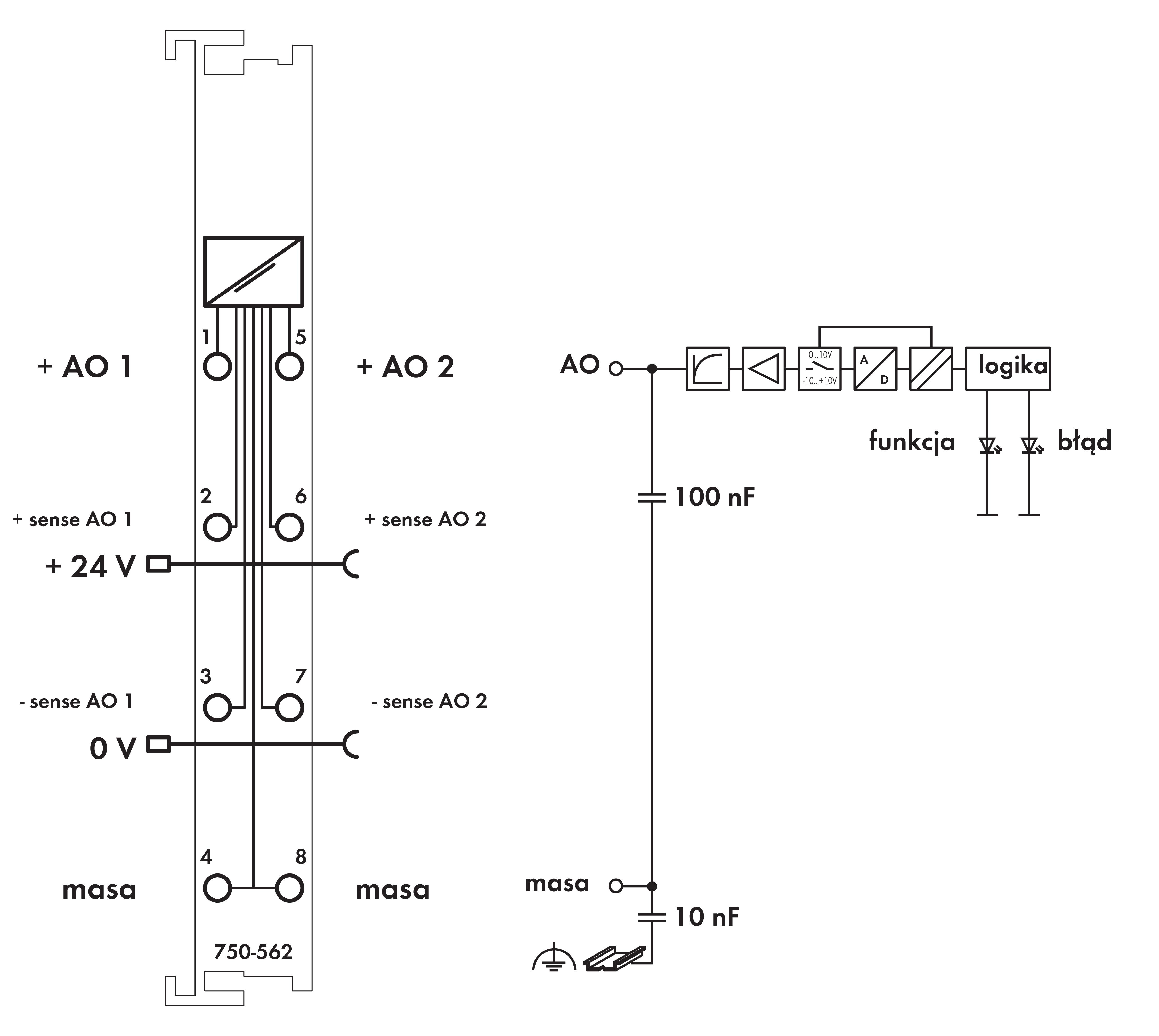 moduł wyjść analogowych 2-kanałowy; 0 … 10 V / ±10 V DC; 16 bitów