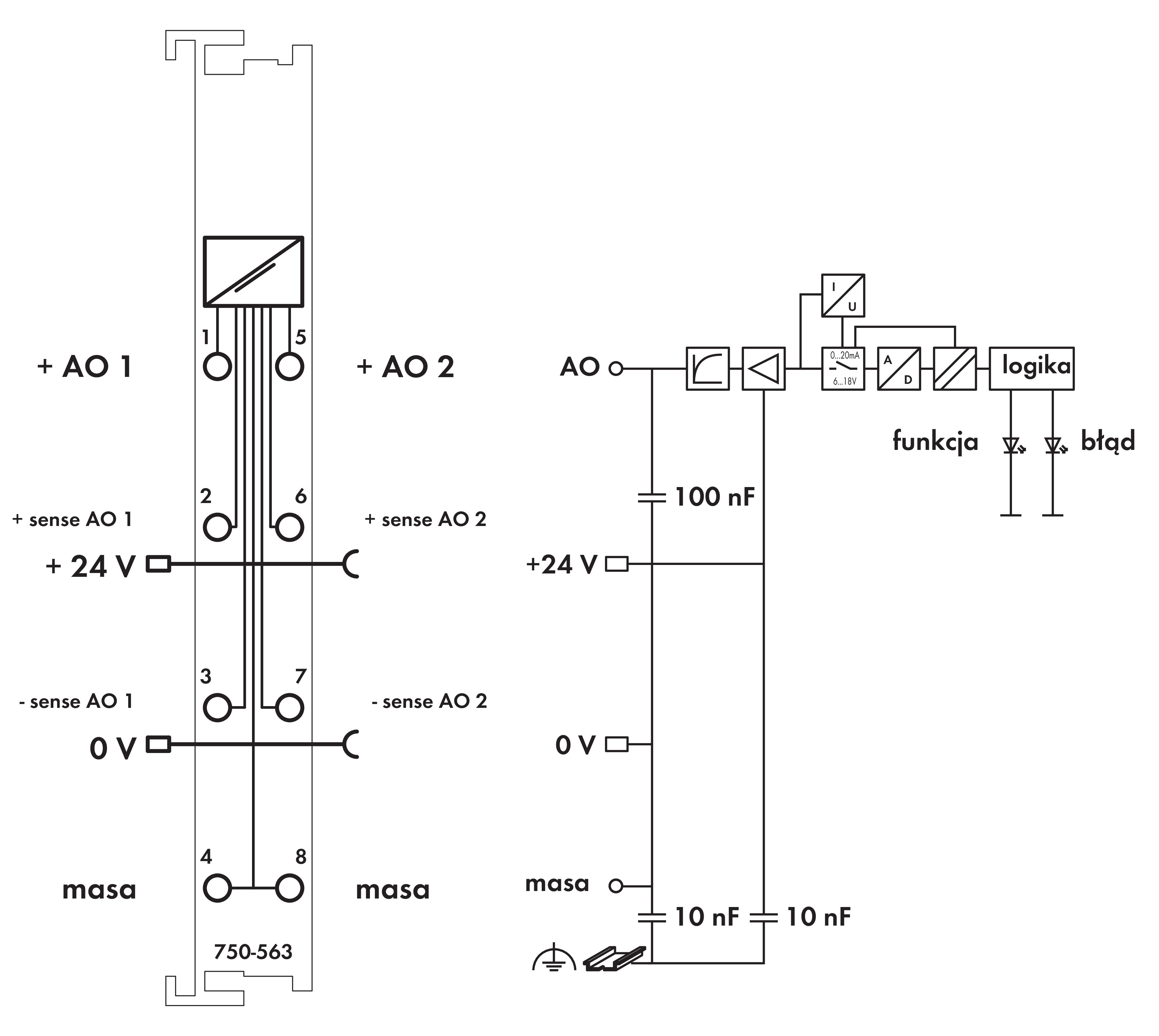 moduł wyjść analogowych 2-kanałowy; 0/4 … 20 mA; 16 bitów; 6 … 18 V DC